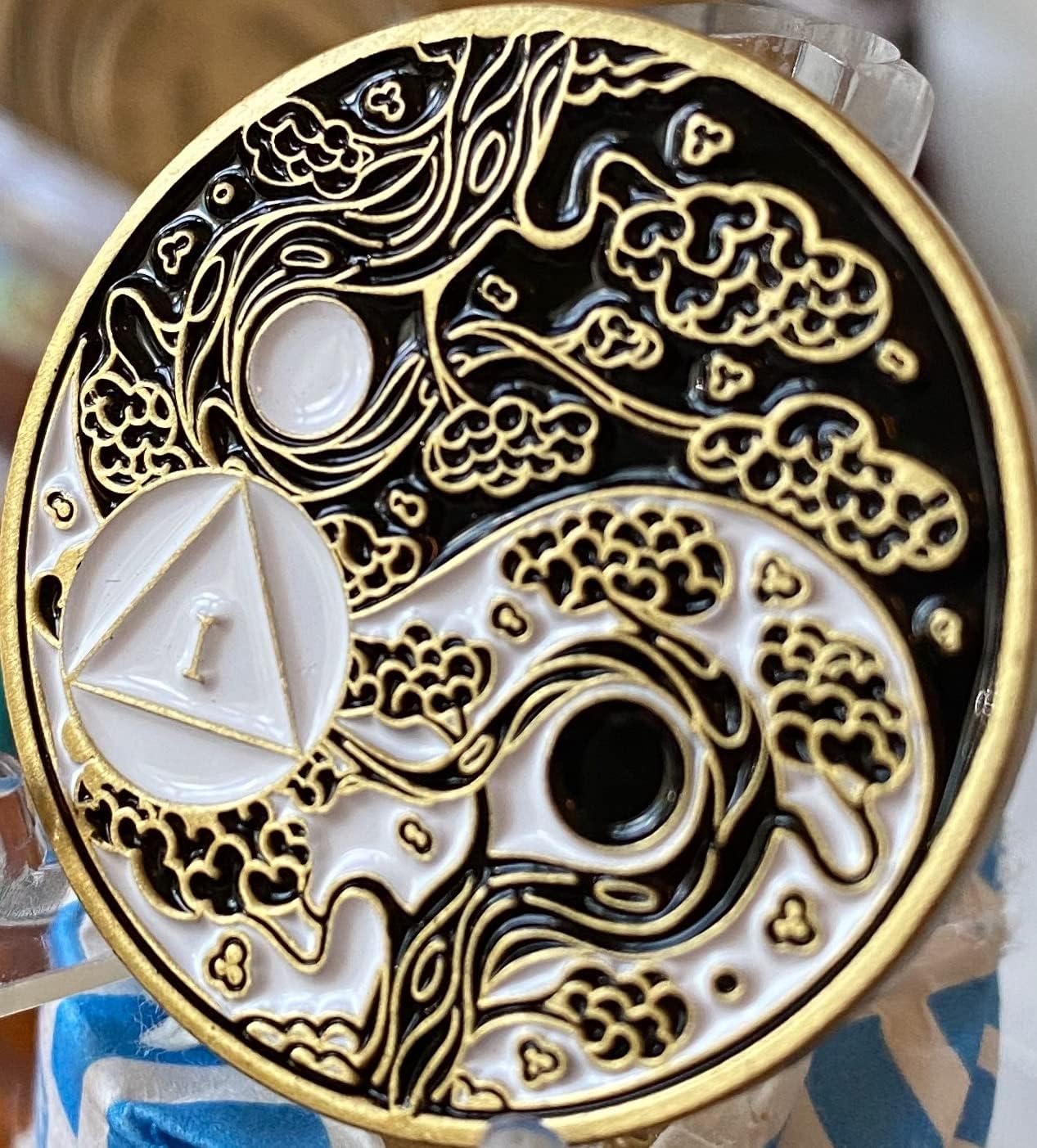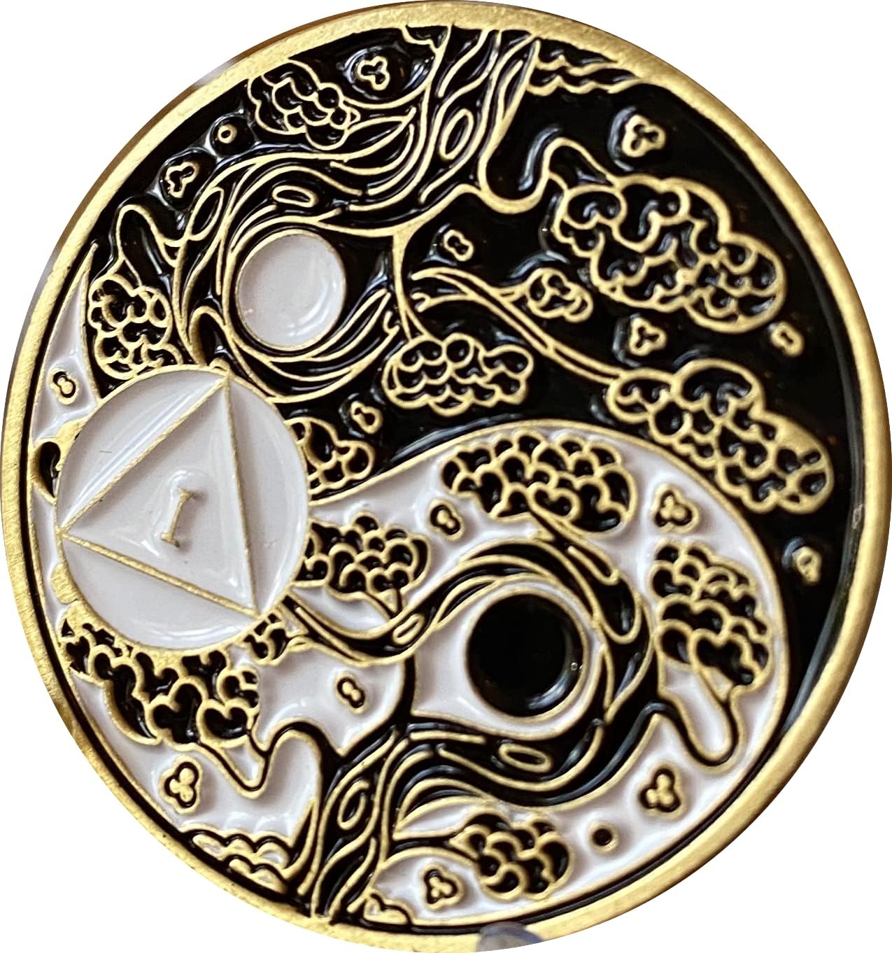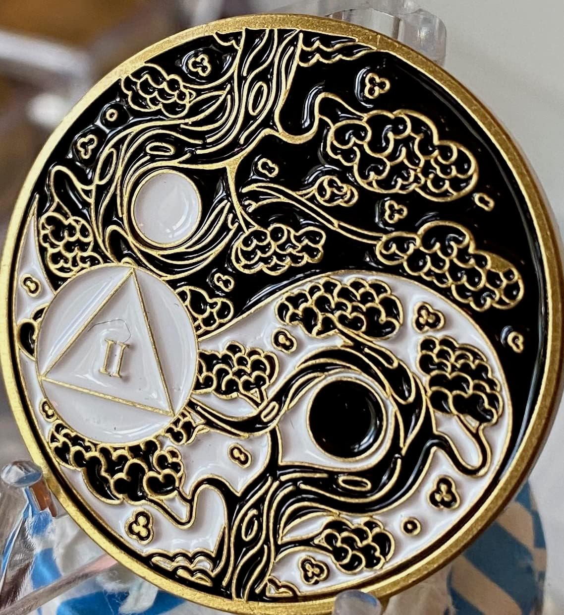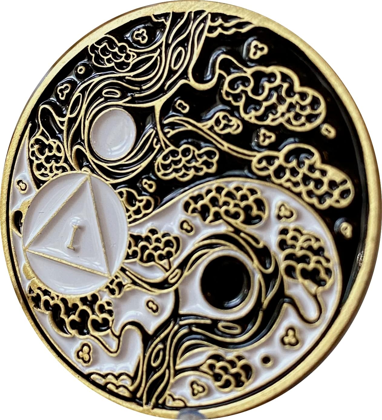 RecoveryChip Medallón AA de 1 año Sakura Tree Cherry Blossom Ying Yang Medallón de oración de serenidad blanco y negro