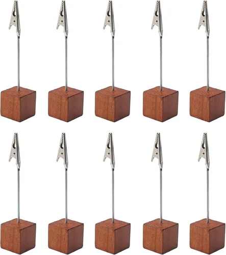 Package Including: You will receive 10pcs brown wooden cube base memo clip holders, Product size: cube base: 25mm×25mm×25mm/ 1inch×1inch×1inch(L*W*H). Each wooden cube base undergoes careful sanding to eliminate splinters and rough edges that could damage delicate wedding decorations or scratch furniture surfaces. Stable Display Solution: These wooden cube base memo clip holders feature a solid square foundation that prevents tipping on restaurant tables, reception desks, or outdoor event surfaces. The alligator clip stands grip table numbers, place cards, and photos securely while the weighted base ensures steady positioning even in breezy wedding ceremony locations. Versatile Event Applications: Perfect for wedding decorations, corporate events, birthday parties, and restaurant table settings. These memo clip holders accommodate various display needs from seating arrangements to menu cards, making them essential for event planners, caterers, and venue coordinators who require reliable place card stands for professional presentations. Strong Gripping Mechanism: The spring-loaded alligator clip stands hold materials ranging from thin paper place cards to thick cardstock photos without slipping. These wooden cube base holders maintain firm grip on table numbers and wedding decorations throughout events, eliminating concerns about cards falling during guest interactions or service activities. Optimal Height Design: Strategically sized to display table numbers and place cards at eye level for seated guests without obstructing conversation views. These alligator clip stands position wedding decorations, photos, and signage at the perfect angle for visibility while maintaining an uncluttered table appearance suitable for formal and casual events alike.