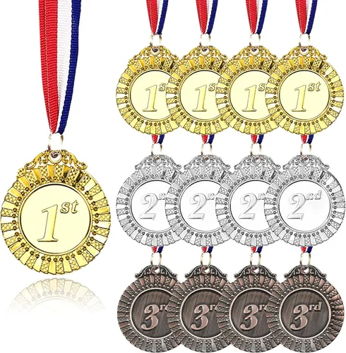 Paquete: Un paquete incluye premios de oro con 1ª, premios de plata con 2ª y premios de bronce con 3ª, 4 unidades de cada medalla, con cinta roja, blanca y azul para el cuello. Material: metal, (aleación de zinc) no plástico. Uso universal: Las medallas de metal son ideales para eventos deportivos, académicos, fiestas, competiciones de vecindario o patio trasero. BUENOS REGALOS PARA NIÑOS: Las medallas ganadoras se pueden usar para recompensar a los niños, nunca olvidarán la emoción cuando ganen la medalla, y se les animará a realizar sus sueños y lograr más objetivos en el futuro. DIÁMETRO: 2 pulgadas, la longitud de la cinta es de 16.34 pulgadas.