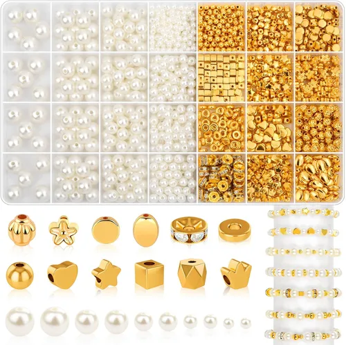 Bracelet Beads kit: This bracelet beads kit contains 552 pieces of white pearl beads in 5 sizes and 800 pieces of gold spacer beads in 12 styles. Enough quantity to meet your different needs for bracelets and jewelry-making Assorted Sizes and Styles: These pearl beads come in 5 Sizes and the spacer beads come in 12 styles. You can choose the most suitable style to make personalized and exquisite jewelry Durable and sturdy: Gold spacer beads are made of acrylic material, non-toxic, light in weight and not easy to fade, smooth surface and are shiny in appearance are perfect for DIY and doing crafts Easy to Use: These jewelry beads are stored in segregated plastic boxes by color for easy use and storage! All the pearl beads for bracelet making have a hole in the middle, Simply thread the cord into the hole and add it to your craft loom project to create elegant pearl necklaces or bracelet gift accessory Wide Application: These gold beads and pearls are suitable for all kinds of jewelry making, such as necklaces, earrings, anklets, rings, brooches, pendants, headpieces, bridal bouquets. They also are used for vase fillers, home decoration, table scatter, lamp shades, chandeliers, Christmas trees, beaded curtains, costume jewelry and craft projects and are good for decorating birthday parties and weddings