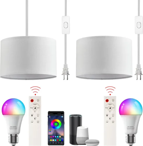 Control Mode: The hanging lamp simultaneously supports 24-key remote control and mobile APP control; It can adjust color effect, brightness, turn on/off, delayed shutdown, and various scene modes Colorful: The pendant light with a plug-in cord comes with a 9W RGBCCT smart bulb, This bulb can be adjusted to 16 million colors, ranging from warm white to cool white (2500K - 6500K), enabling you to create your desired lighting effect Application Scenario: The lampshade of the hanging lights is made of natural beige linen, which is very suitable for living room, bedroom, study, children's room, office, kitchen island and holiday decoration Easy to Install: The Plug in pendant light with a cord comes with installation instructions and all the necessary installation accessories; There is no need for hardwiring, just plug the chandelier into an outlet once it is hung up About pendant light: the hanging light shade is made of natural linen fabric, which provides a soft and comfortable light, and uses smart bulbs with an E26 base, or you can replace the other E26 bulbs yourself
