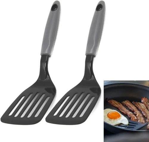 2 piezas de nylon Turner ranurado resistente al calor herramientas de cocina utensilios espátula aleta! ! Nylon soporta temperaturas de hasta 450 grados Farenheit. No raspa recubrimientos antiadherentes. El tamaño más pequeño hace que sea fácil de almacenar. Los colores neutros combinan con cualquier cocina. Apto para lavavajillas. Medidas: 10.5" L