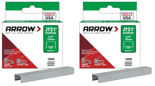 Arrow JT21 Series 276 - Grapa plana para corona, corona de 7/16 pulgadas, pata de 3/8 pulgadas, 1000, paquete Las grapas JT21 son el hermano pequeño del T50. Aunque a menudo se refiere como servicio ligero, realmente no hay nada "Luz" en ellos. Construidas con la misma calidad y precisión que la T50, estas grapas utilizan un alambre más delgado en un formato de grapa más pequeño para ofrecer una gran potencia de sujeción. Son excepcionalmente fáciles de disparar, lo que hace que las grapas JT21 sean las favoritas entre los artesanos, las mujeres y aquellos con fuerza de agarre limitada. Se utiliza para reparaciones generales del hogar, manualidades, proyectos de arte y tapicería. Fabricado con orgullo en los Estados Unidos. Paquete de 2.