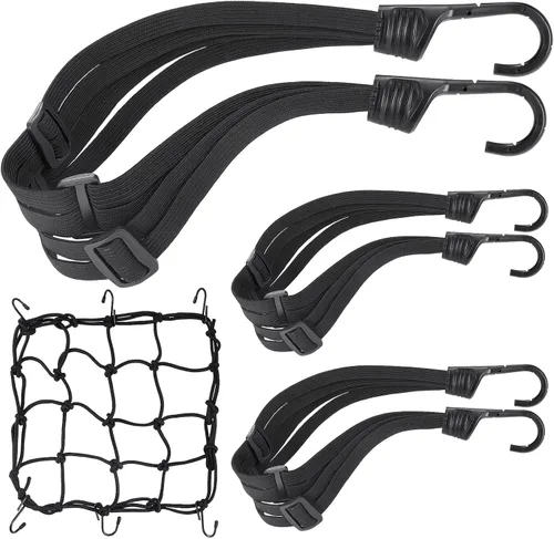 【4-en-1 Correas Elásticas】Estas correas elásticas para equipaje de motocicleta no necesitan envolverse tantas veces como otras cuerdas elásticas para asegurar la carga. Cada correa elástica consta de 4 cuerdas elásticas, y puedes ajustar la distancia o el lugar de estos cordones elásticos según sea necesario para fijar mejor la carga. Solo se necesita una correa elástica para fijar el equipaje o el casco en la bicicleta. Fácil de instalar y descargar. 【Estructura de Alta Resistencia】Nuestras correas de nylon tejidas para casco de motocicleta consisten en cables de goma elástica engrosados, ofreciendo una excepcional resistencia a la abrasión y durabilidad elástica. Y los ganchos de alta resistencia están fabricados con una carcasa de ABS resistente con alambre interior de acero, asegurando un agarre firme y seguro, evitando que tu equipaje se mueva durante el viaje. Diseño de hebilla deslizante: cada correa de motocicleta está diseñada con una hebilla deslizante. Ajusta fácilmente las hebillas para adaptarse a tu equipaje, casco u otro equipo, asegurando un ajuste seguro en todo momento. 【Alta elasticidad】Cada cordón elástico para bicicleta con ganchos mide 60 cm / 23.6 pulgadas y se puede estirar hasta un máximo de 110 cm. La red para casco mide 30 x 30 cm. 【Amplia aplicación】Estas cuerdas elásticas con ganchos se utilizan ampliamente para bicicletas, motocicletas, carretillas, vehículos eléctricos; y son ideales para fijar los cascos, maletas, cago, estantes y más.