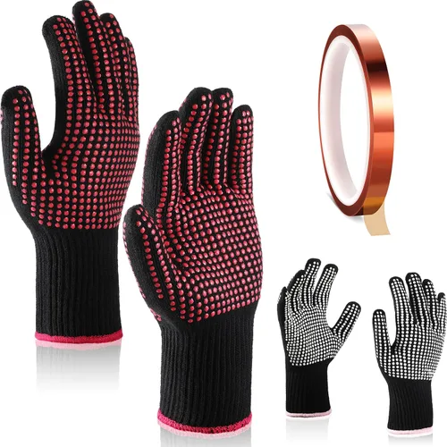 El paquete incluye: recibirás 2 pares de guantes resistentes al calor con protuberancias de silicona y 1 rollo de cinta de sublimación resistente al calor de 0.39 pulgadas x 108.27 pies de alta temperatura para transferencia de calor en el paquete; se puede aplicar suficiente cantidad para satisfacer tus diversas necesidades diarias y reemplazo Diseño de silicona de doble cara: la superficie del guante tiene golpes de silicona resistentes a altas temperaturas, que pueden aislar mejor tus manos de la fuente de calefacción; la temperatura límite de protección puede alcanzar los 300 grados centígrados, evitando eficazmente quemaduras a alta temperatura Material de calidad: está hecho de poliéster y silicona resistente al calor de calidad, que tiene un cierto grado de resistencia al calor; los golpes de silicona de los guantes rizados están diseñados para el contacto térmico accidental para evitar quemaduras. Si tocas una superficie muy caliente, todavía puedes sentir el vapor caliente; ten cuidado de no seguir tocando el lugar caliente durante más de 5 segundos para evitar otros peligros ocultos Flexible de llevar: el material suave de los guantes tiene un cierto grado de elasticidad, adecuado para la mayoría de las manos de las mujeres, los guantes resistentes a altas temperaturas son flexibles de llevar, cómodos y transpirables Amplias aplicaciones: los guantes resistentes al calor son adecuados para uso personal en peluquerías u hogares, evitando eficazmente quemaduras en los dedos, no solo son adecuados para planchas de pelo, planchas de pelo, planchas de vapor de ropa, varitas de permanente, cepillos de aire caliente y otras herramientas, sino también para uso con cintas resistentes a la temperatura y aplicaciones de transferencia de calor