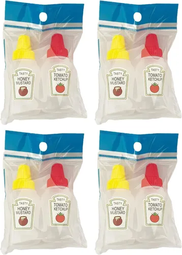 Capacidad: cada botella tiene capacidad para 0.8 fl oz de condimentos, tamaño perfecto para porciones individuales y control de porciones cuando viajas o empacas almuerzos Cantidad: el juego incluye 4 pares (8 en total) de botellas de plástico transparente con tapas resistentes a fugas para un almacenamiento seguro Uso versátil: ideal para almacenar y dispensar ketchup, aderezo para ensaladas, miel, salsas y otros condimentos líquidos Fácil de transportar: el tamaño compacto encaja perfectamente en cajas bento, bolsas de almuerzo y cestas de picnic para comidas sobre la marcha Diseño práctico: botellas fáciles de apretar con tapas giratorias que permiten una dispensación precisa y un llenado simple