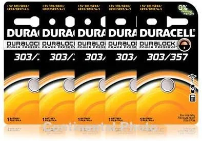 Tira de 5 pilas Duracell 357 Óxido de plata. Reemplaza: AG13; LR1154; EPX76; A76; LR44; SR44SW/W Uso en calculadoras, relojes y una variedad de pequeños artículos electrónicos y juguetes