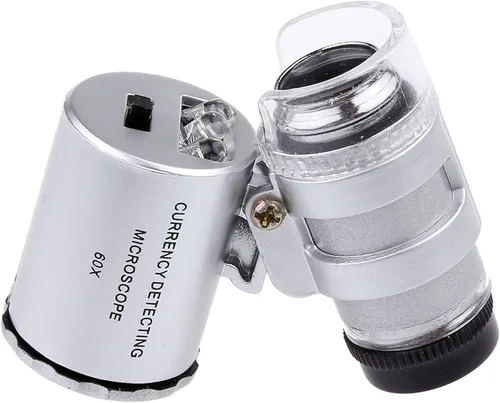 Esta mini lupa iluminada de 60 aumentos está construida en plástico ABS duradero con doble luz LED brillante y luz de detección UV. Esta mini lupa es ideal para coleccionistas de rocas, coleccionistas de monedas, joyeros, aficionados, y también es un gran regalo para que los niños exploren el fabuloso mundo pequeño. Luz LED brillante y UV: puede ver objetos claramente en condiciones de luz oscura o insuficiente con esta fuente de luz LED dual. La luz UV funciona como un detector de falsificaciones para cosas como el papel moneda, pasaportes, tarjetas de crédito, cheques de viajero, etc. Tamaño de bolsillo y peso ligero: es muy cómodo de llevar y se puede utilizar en cualquier lugar. Requiere 3 baterías LR1130 (pilas incluidas). Con kare y amable paquete al por menor.