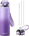 DRINK 64 OUNCES OF WATER DAILY EASILY WITH THIS WATER BOTTLE: With a time marker measuring how much water you should be drinking hour-by-hour, you can stay on track with your water consumption each day. A wide opening, 32-oz capacity with Fast Water Flow Technology make your drinking experience a delight. HEALTHY & DELICIOUS H20 WITH A FRUIT INFUSION FILTER: With an in-built fruit infusion filter, a cold, refreshing fruits flavored drink is ready at your service any time. One-Hand Opening Technology: Make hydration an effortless daily habit. Open it with just one hand, drink easily with Fast Water Flow Technology and refill fastly with a wide bottle opening! 100% Leakproof: The lid of the cup is equipped with a silicone sealing ring. This Water Bottle will NEVER leak in any situation even when it is reversed! Powerful Reminders And Motivations: Hour-by-hour, you’ll know exactly how much water you should be drinking throughout the day. With a huge 32-oz capacity, say goodbye to constantly running back and forth for refills. With our Water Bottle, you just need to refill once to hit your daily hydration goals.