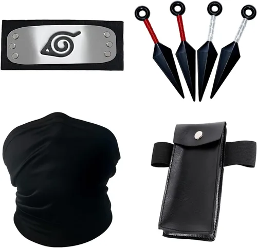 Especificaciones: Tamaño de las diademas: 43 pulgadas, tamaño del metal: 4x1.6 pulgadas Material de la diadema: nailon + acolchado de cuero + metal (doblable) Tamaño Kunai: 5.1 pulgadas Material de Kunai: Plástico Material plástico de accesorios ninja: Plástico Perfecto para cosplay de Naruto, gran regalo para los fanáticos de Naruto.