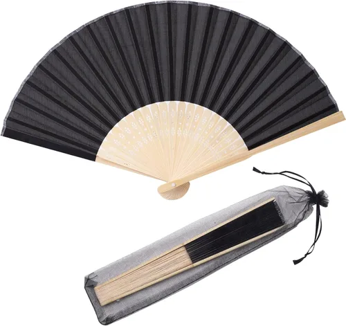 Material de la superficie del ventilador plegable: Tela de seda imitada Tamaño: 8.3 pulgadas de longitud cuando está cerrado; 14.6 pulgadas de ancho cuando está abierto Paquete: 24 abanicos de mano con 24 bolsas de organza Color: negro Ocasiones: Adecuado para recuerdos de fiesta de boda y regalos de fiesta de despedida de soltera y decoración del hogar
