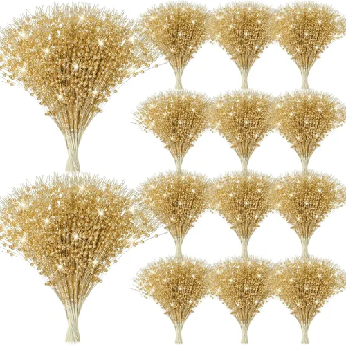WILLBOND 100 ramos de flores doradas, adornos de tallo de bayas de Navidad con purpurina, palitos decorativos artificiales, ramas doradas