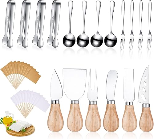 Bonita combinación: el paquete contiene 1 cuchillo esparcidor de mantequilla con mango de madera, 4 cuchillos esparcidores de queso con mango de madera, 1 tenedor cortador de queso con mango de madera, 4 cucharas, 4 tenedores y 4 pinzas para servir, cantidad suficiente y varios estilos para satisfacer tus necesidades en la vida diaria Material de calidad: el juego de cuchillos esparcidores está hecho de acero inoxidable, todas las herramientas tienen un mango de madera, excepto las cucharas, pinzas y tenedores, no se oxidan ni rompen fácilmente, no se doblan fácilmente, se pueden aplicar durante mucho tiempo y muchas veces Regalo práctico: con aspecto suave y exquisito, combinado con varios estilos, el juego de cuchillos esparcidores de queso y mantequilla es un buen regalo para familiares o amigos en fiestas de cumpleaños y fiestas de inauguración de la casa, también una colección encantadora para personas a las que les gusta coleccionar vajilla linda y hermosa Herramienta de cocina multiusos: este juego de cuchillos esparcidores de queso es un práctico juego de herramientas para comer queso, mantequilla o crema, las cucharas, tenedores y pinzas son útiles para beber café o comer postres, yogur, helado, huevos duros, aperitivos, salsas para sumergir, condimentos, azúcar, etc Fácil de agarrar y transportar: cada cuchillo esparcidor de mantequilla con mango de madera mide aproximadamente 5 pulgadas, el tenedor mide aproximadamente 5.11 x 0.4 pulgadas / 5.1 x 0.4 in, la cuchara mide aproximadamente 4.33 x 1.02 pulgadas / 4.3 x 1.0 in y la pinza para servir es de aproximadamente 4.33 x 0.62 pulgadas/4.3 x 0.6 in, tamaño adecuado para agarrar y ser embalado en una bolsa cuando se hace un picnic o barbacoa