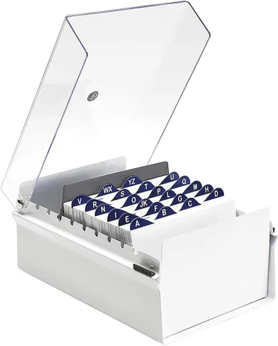 Acrimet Organizador de archivos de 4 x 6 tarjetas, base de metal, resistente (tarjetas de índice AZ y divisor incluidos) (color blanco con tapa de