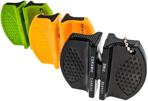 Dimensiones: 2-1/4 x 3 pulgadas Afiladores de cerámica y carburo Colores surtidos: verde, naranja y negro