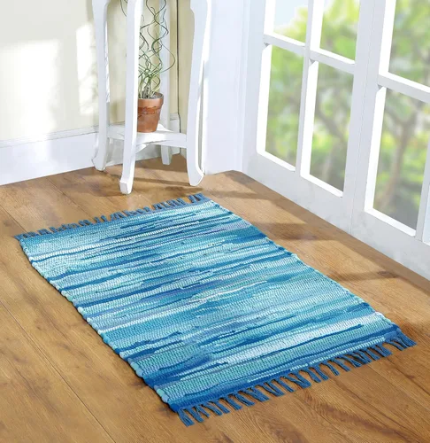 Alfombra de algodón de 24 x 36 pulgadas, multicolor, tejida a mano, lavable y reversible para sala de estar, cocina, entrada, con borlas (aguamarina)