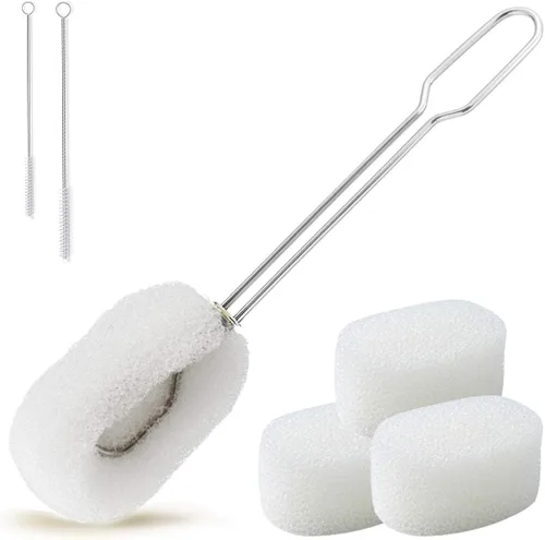 Múltiples contenidos: incluye 1 cepillo de esponja para botellas de 14 pulgadas de largo, 2 cepillos de paja de limpieza de diferentes tamaños, 10.5 pulgadas y 7.75 pulgadas, 3 cabezales de esponja reemplazables Simple y eficaz: la esponja para botellas es suave, puede llegar al fondo y al interior de las botellas, no solo las cerdas endebles de un cepillo para botellas. Estructura de nido de abeja: la estructura especial hace que mantenga bien la espuma de jabón y tenga un gran poder de fregado, sin rayar superficies delicadas. Abrazadera y cepillo para pajitas: fácil de cambiar el relleno de esponja y puedes utilizar la abrazadera del mango para sostener otras cosas: paños, bolas de acero, etc. 2 cepillos largos para popotes hacen que sea muy fácil limpiar todo tipo de popotes. Amplia aplicación: este es un limpiador de cepillo que se puede utilizar en la mayoría de las superficies: biberones, vasos altos, tazas, platos, sartenes, fregadero, taza de vacío, hervidores, licuadoras, cafetera y vaso de viaje. La gran sensación y agarre hacen que tu trabajo de limpieza sea más fácil.