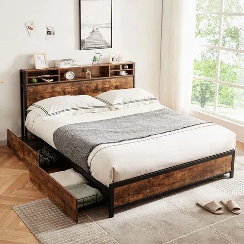 Alohappy Base de cama de tamaño matrimonial con cabecera de estantería y 4 cajones de almacenamiento marco de cama de plataforma de metal