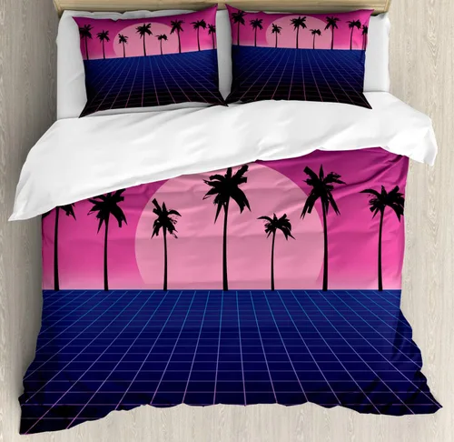 Ambesonne Synthwave - Juego de funda de edredón y suelo de cuadrícula retro con siluetas de palma y diseño de vibraciones de vapor de los años 80 de 88 x 88 pulgadas