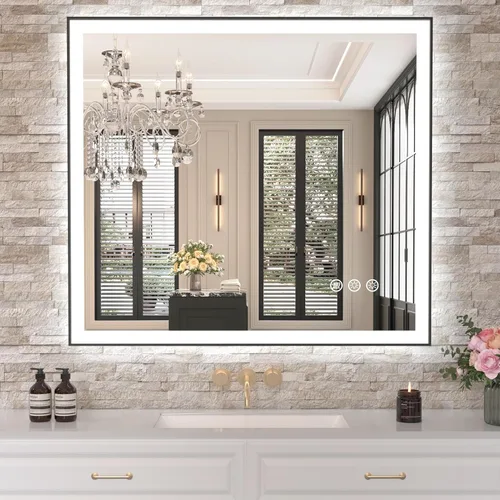 Iluminación superbrillante y de tres colores: el espejo iluminado Amorho cuenta con dos tiras LED integradas, que ofrecen un rendimiento mejorado en comparación con las alternativas de una sola tira. Con una alta densidad de LED de 192 perlas por metro y una salida de potencia de 24 W, CRI 90+, ofrece una amplia iluminación para tu baño. Nuestro espejo también soporta temperaturas de color ajustables en tres ajustes distintos. Puedes elegir entre blanco cálido (6000 K), luz natural (4000 K) o blanco frío (3000 K) con el botón para un ambiente personalizado Luz frontal y control retroiluminado independiente: nuestro espejo LED incorpora un controlador más avanzado que permite un control independiente de las luces delanteras y traseras. Ambas tiras LED admiten ajustes de temperatura de tres colores, ofreciendo 12 modos de iluminación para maximizar el ambiente de tu baño. El brillo se puede ajustar del 10% al 100%, listado UL. 【Antivaho】Después de 5 minutos de abrir el desempañador, el calentador en el espejo dispersará la niebla desde el centro hacia los lados, el espejo seguirá reflejándose claramente en el baño rodeado de aire caliente. Para facilitar su uso y ahorro de energía, el desempañador se encenderá después de estar conectado a la alimentación y se apagará automáticamente después de funcionar durante 1 hora. Vidrio templado HD y marco de metal negro: este espejo LED está hecho de vidrio templado duradero de 0.197 in, ofreciendo un reflejo claro y sin distorsión. No se fragmenta en piezas afiladas incluso bajo fuerza externa, proporciona seguridad para uso familiar. Y nuestro espejo ha pasado la prueba de nivel de impermeabilidad IP65, lo que garantiza una claridad y seguridad duraderas en ambientes húmedos. A prueba de explosiones y resistente a los arañazos. Fácil instalación y bien empaquetado: para una entrega segura, el espejo viene empaquetado de forma segura en una caja de cartón duradera y cuidadosamente protegido con espuma anticolisión. Dentro del paquete, encontrarás el espejo, ganchos de montaje, anclajes de pared y guantes para ayudar con la instalación. Puedes alimentar el espejo con el enchufe incluido, o cortar el enchufe y conectarlo directamente a un interruptor de pared. El espejo se puede montar horizontal o verticalmente, ofreciendo flexibilidad para adaptarse a su espacio y preferencia. Botones táctiles: para apagar todos los botones azules, puedes mantener presionado el botón de desempañamiento durante 3 segundos. Todos los botones son muy sensibles. Incluso con las manos mojadas, puedes controlarlas sin esfuerzo y cómodamente.