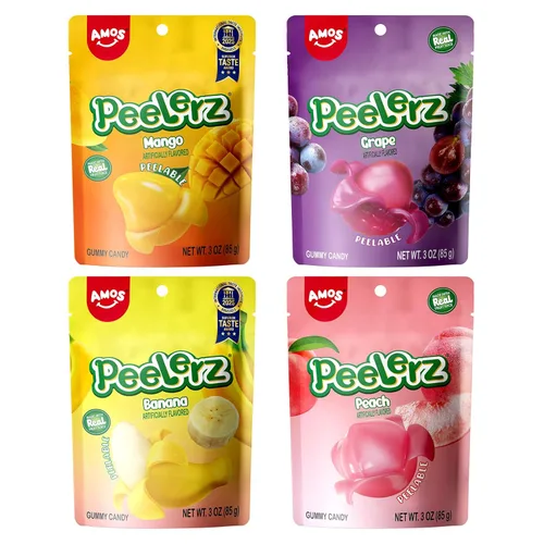 Presentamos Peelerz Gummy 4 Flavors: el caramelo divertido e interactivo que hace que la hora de la merienda sea una experiencia emocionante. Cada gomita en forma de mango, uva, plátano y melocotón ofrece un toque único: simplemente retira la capa exterior para revelar un centro de gomita con sabor masticable, o disfrútalo como es para una doble dosis de diversión. La gomita Peelerz está hecha con jugo de fruta real, dándole un sabor audaz y tropical que es irresistible en cada bocado. Perfecta tanto para niños como para adultos, la gomita Peelerz de Amos combina un diseño divertido y pelable con una textura deliciosa y masticable. compartir en fiestas o agregar a los almuerzos escolares. Ya sea que estés disfrutando de un momento acogedor en casa o una reunión divertida con amigos y familiares, la goma Peelerz añade un toque dulce y afrutado a tu aperitivo de otoño e invierno. Disfruta de la combinación perfecta de diversión y sabor con la goma Peelerz, el regalo pelable y jugoso que a todos les encantará