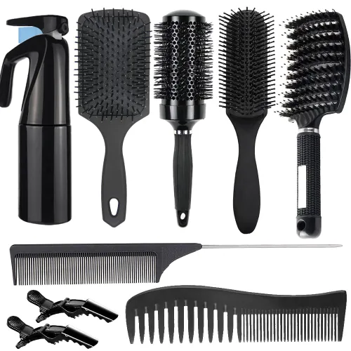 Juego de cepillos desenredantes 8 en 1: este juego de cepillos para el cabello incluye 1 cepillo desenredante de nailon de 9 filas, 1 cepillo desenredante para el cabello, 1 botella de spray para el cabello, 1 cepillo redondo, 1 cepillo de paleta para cabello natural, 1 peine de dientes anchos, 1 peine de cola, 2 pinzas para el pelo de cocodrilo. Los mejores cepillos desenredantes para cabello natural pueden satisfacer tus diferentes necesidades de cuidado del cabello para facilitar los días de lavado. Cepillo desenredante y botella de aerosol: Este cepillo desenredante para cabello rizado es perfecto para cabello afroamericano con cabello súper rizado de 3a a 4c, con cerdas de nailon suaves flexibles y un soporte desmontable, las cerdas de nailon pueden deslizarse fácilmente a través de enredos y nudos sin dolor y desenredar fácilmente. Botella de spray para cabello, niebla súper fina continua, botella de spray para el cabello es muy útil y conveniente en la vida diaria, puedes mezclar una pequeña cantidad de productos para el cuidado del cabello en agua. Cepillo definido de 9 filas: cepillos de peinado de cerdas de nailon con cojín de 9 filas para separar, dar forma, definir rizos, secar con soplado, peinar, desenredar. Cerdas de nailon hechas de hebras de nailon suaves, redondeadas y resistentes al calor, evita que el cabello se escape durante el proceso de secado, creando menos fricción durante el aseo, alisando, moldeando y puliendo perfectamente el cabello. Cepillos redondos para el cabello para mujeres: este cepillo redondo de cerámica puede reducir el tiempo de secado por soplado hasta en un 50%, gracias a su barril de ventilación turbo de cerámica extra grande y núcleo que permite que pase más aire a través del cepillo de su secador. Por lo tanto, si quieres un cabello levantado con volumen adicional, este juego de cepillos para peinar el cabello es imprescindible. Juego de cepillo y peine para mujeres: este cepillo de pelo de paleta para mujer se puede utilizar, no importa qué tipo de estilo de cabello tengas, este juego de cepillos para el cabello funciona muy bien en cabello húmedo, seco, largo, corto, grueso, rizado y desenredante. El kit de peinado para mujer es ideal para salón y uso doméstico. Si tienes alguna pregunta sobre el producto, siempre puedes preguntarnos y responder en 24 horas.