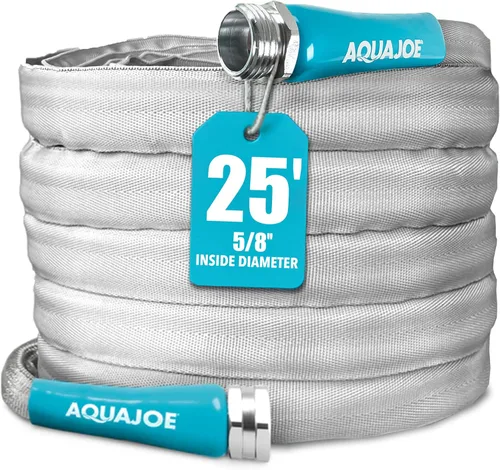 Di adiós a las mangueras enredadas y pesadas con la manguera de jardín Aqua Joe XTREME FIBERJACKET flexible y resistente a las torceduras. Diseñada para un alto rendimiento y durabilidad, esta manguera cuenta con un diámetro de 5/8 pulgadas con un exterior resistente de fibra de grado marino que rodea un núcleo interior flexible de 5/8 pulgadas. Con clasificación de explosión de hasta 600 PSI, ofrece una resistencia superior mientras que sigue siendo ultraligero y fácil de manejar. El diseño resistente a las torceduras, torsiones y enredos garantiza un flujo de agua continuo y constante, y la construcción compacta hace que sea fácil de enrollar y almacenar. Disponible en múltiples longitudes, es la solución ideal para todo, desde el cuidado del jardín y el césped hasta la limpieza de patios, garajes o muelles de barcos. Diseñada para mayor comodidad y fiabilidad, esta manguera incluye asas de agarre resistentes y flexibles y accesorios de metal resistentes para una conexión segura y resistente a las fugas. Construido para soportar temperaturas frías de hasta 35 °F, resiste la acumulación de suciedad y se mantiene flexible temporada tras temporada. La chaqueta resistente, resistente a desgarros y a la abrasión es suave en superficies pintadas y delicadas, por lo que puedes moverla libremente sin preocupaciones. ¡Mantén tu césped y jardín exuberantes con Aqua Joe! Nuestra robusta colección de mangueras, boquillas y rociadores está diseñada para todo tipo de propiedad y está diseñada para ayudarlo a mantener un hermoso espacio al aire libre, año tras año. Aqua Joe es parte de la familia de marcas Joe, dedicada al diseño, fabricación y comercialización de herramientas innovadoras y de alta calidad para el hogar, patio, jardín y garaje. Con una mentalidad y soluciones orientadas a propósitos, proporcionamos la herramienta adecuada para cada trabajo, lo que facilita ir con Joe y hacerlo bien.