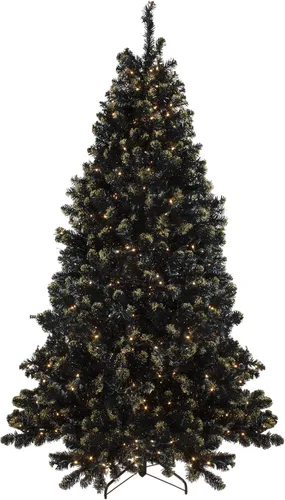 Pino de cristal negro con brillo dorado árbol de Navidad artificial Construcción de ramas con bisagras; árbol de perfil completo Viene con 4 piezas de fácil montaje, incluyendo soporte El árbol mide 7.5 pies de alto por 55 pulgadas de diámetro