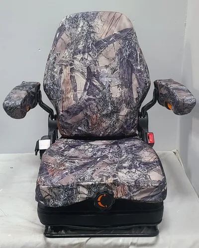 Asiento de carretilla elevadora/tractor con bolsa de documentos y reposabrazos ajustable. Asiento de suspensión mecánica con cinturón de seguridad retráctil e interruptor de asiento. Los patrones de montaje incluyen (W*L): 12.875" y 11.25" de lado a lado. Los toboganes se pueden montar lateralmente a 11.25", 12.59" o 12.91" Medidas del asiento: 17 pulgadas de ancho x 20 pulgadas de profundidad x 27 pulgadas de alto El asiento se puede plegar hacia adelante plano contra la parte inferior del asiento. El asiento está personalizado en nuestra cubierta protectora protectora extraíble Endura impermeable MC2 Camo