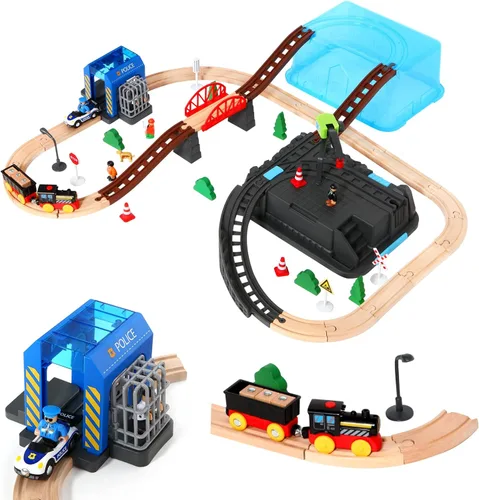 Asweets Juego de tren de madera para niños pequeños, 66 piezas con tren de locomotora a batería, para Thomas, Brio, Chuggington, Melissa y Doug