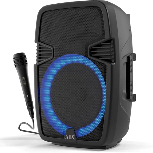Pregunta sugerida sobre Audiobox ABX-160R Sistema de altavoces PA Bluetooth portátil de 15 pulgadas con micrófono con cable de karaoke, luces de fiesta multicolor y sonido ¿Este modelo es compatible con mi celular o computador?