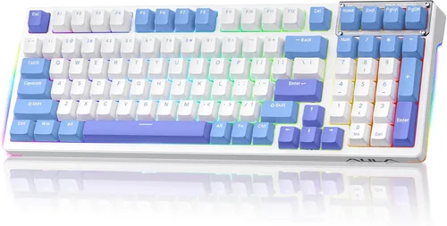 Conexión multidispositivo: el teclado inalámbrico AULA de 99 teclas admite Bluetooth, conectividad inalámbrica de 2.4 GHz y cable USB, que se puede cambiar fácilmente entre 5 dispositivos a través de teclas de acceso directo o teclas laterales. El teclado cremoso es adecuado para aplicar a varios entornos como el hogar, la oficina, al aire libre, etc. Puede satisfacer las necesidades de la mayoría de los usuarios. Batería de gran capacidad de 4000 mAh, batería de larga duración, sin necesidad de cambiar/cargar la batería con frecuencia Teclado personalizado de intercambio en caliente: este teclado bluetooth admite interruptor de 3 pines/5 pines, puede reemplazar fácilmente los interruptores y las teclas, bricolaje su exclusivo teclado lindo. Reemplazar el interruptor defectuoso solo puede ahorrar costos de reparación y mejorar la vida útil del teclado. El juego de teclado morado con estabilizadores prelubricados e interruptores LEOBOG Reaper ofrece una experiencia de escritura más suave y un sonido cremoso, un tiempo de respuesta más rápido te ayuda a estar un paso adelante en el juego y ser el ganador al final Estructura de la junta y ranura de una sola tecla PCBA: Este teclado silencioso cuenta con una estructura de junta, almohadilla de silicona integrada extendida y ranura de una sola tecla PCB para optimizar mejor la resistencia y la estabilidad para una sensación más suave y resistente. 5 capas de silenciadores de llenado llenan los huecos entre la PCB, la placa de posicionamiento y el interruptor para reducir eficazmente el ruido de la tecla mecánica pesada y pesada del teclado y proporcionar una sensación sólida Retroiluminación RGB de 16,8 millones: este teclado iluminado cuenta con brillantes efectos de iluminación RGB. 16 efectos de iluminación preestablecidos añaden un gran ambiente a tus juegos. El controlador admite 10 efectos de iluminación de ritmo musical genial. El brillo y la velocidad de iluminación se pueden ajustar con la mezcla de teclas FN+, crea configuraciones de iluminación únicas para animar tu teclado y escenas de juego Controladores profesionales: Todas las teclas de este teclado USB admiten macro personalizar, grabar y editar macros para programar una serie de operaciones complejas en una sola tecla, reduciendo las acciones repetitivas y aumentando su tasa de ganancia de juegos. El teclado ASMR F98 es un teclado mecánico profesional en términos de estructura y función. El teclado de diseño al 95% con numpad tiene todas las funciones y te ahorra más espacio en el escritorio, rollover de teclas N y el bloqueo de teclas WIN evita errores en emocionantes juegos en tiempo real Teclas PBT y placa de metal: Las teclas azules moradas frescas y elegantes son más adecuadas para que seas diferente. La placa de identificación de metal decora tu teclado con un sentido de la tecnología. Nuestras teclas PBT de 3 colores son de doble moldeo por inyección y proceso de sublimación de calor, a prueba de sudor y duraderas sin decoloración, la superficie esmerilada es más suave al tacto, la retroiluminación del teclado de computadora a través de la fuente ilumina claramente cada tecla, lo que te permite operar con precisión en la oscuridad Servicio posventa completo: AULA proporciona 48 meses de servicio posventa para garantizar que no tengas preocupaciones mientras usas el teclado con clic. Ya sea un problema de calidad del producto o un problema de uso, nuestro equipo profesional siempre está listo para ofrecer soporte y soluciones