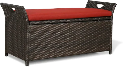 El banco de almacenamiento está hecho de marco de acero recubierto de polvo resistente, resistente al óxido, más fuerte y estable. Envuelto con mimbre de polietileno de alta calidad, tejido a mano, resistente a la intemperie y resistente a los rayos UV Construida con un estilo de diseño versátil, la caja de terraza para exteriores no solo es para almacenamiento, sino que también es un banco. Puedes sentarte en él, descansar cómodamente. El asiento es lo suficientemente grande para 2 personas sentadas juntas. El cojín de banco se puede lavar y también es lo suficientemente suave y resistente para sentarse Sistema de soporte neumático para hacer que las tapas se abran suavemente, ahorrando esfuerzo, e ideal para apoyar la tapa para mantenerla abierta Diseño humanizado de mango lateral, hace que sea fácil mover esta caja Dimensiones totales: 37.75"x17.75"x20.5". Requiere montaje sencillo