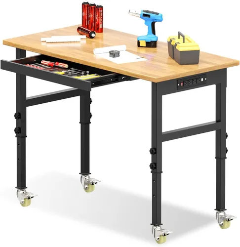 Banco de trabajo resistente de altura ajustable de 48 pulgadas, banco de trabajo con parte superior de madera de goma, con cajones de toma de