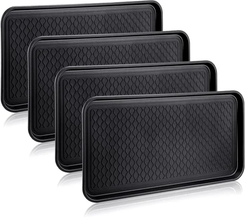 Material fiable: nuestra alfombrilla multiusos para zapatos está hecha de material de polipropileno, que es seguro y confiable, no se deforma ni rompe fácilmente, puede soportar tu uso repetido, y es fácil de almacenar y no ocupa demasiado espacio Cómodo de limpiar: la superficie del tapete para cuenco para perro está diseñada con un patrón de ondas, que es fácil de limpiar, solo tienes que utilizar la manguera de jardín o el grifo de agua para limpiarlo, diseño simple pero clásico que puede adaptarse a diferentes estilos de casa Función práctica: material ligero pero rígido que hace que la bandeja sea fácil de usar y mover; excelente para poner debajo de las plantas y para llevar dentro o al exterior; útil también para herramientas de jardinería; Los paraguas y zapatos sucios funcionan bien en días lluviosos Lo que recibes: recibirás 4 bandejas de zapatos de agua para botas en el paquete, cantidad suficiente y tamaño grande es conveniente para que puedas usar en diferentes ocasiones Amplia aplicación: la protección antideslizante para el suelo se puede aplicar como tapete de comida para perros, bandeja de pintura, tapete de barro para zapatos, tapete de suelo de nieve, bandeja de caja de arena, tapete de goma para perros, tapete de invierno y mucho más; uso en una habitación de barro, garaje o vestíbulo; protección impermeable para cuencos de comida para perros, cajas de arena, jaulas, peceras, más