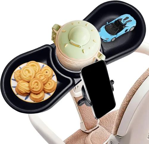 Bandeja de aperitivos 4 en 1: nuestra bandeja de aperitivos para cochecito combina una bandeja de alimentos, portavasos, soporte para teléfono y bandeja de juguetes en uno, proporcionando una solución integral para el bebé en movimiento. Es ideal para padres que buscan mejorar la practicidad y la comodidad de su cochecito Partición científica y rotación de 360°: la división clara de las áreas de alimentos y juguetes ayuda a los bebés a desarrollar buenos hábitos alimenticios de forma independiente. La bandeja es 1.6 in más profunda para evitar que los alimentos y los juguetes se vuelquen. La rotación de 360° te permite elegir entre áreas de alimentos y juguetes de acuerdo a tus necesidades. Material seguro y fácil de limpiar: nuestra bandeja de aperitivos para cochecito está hecha de material ABS, que no es tóxico e inofensivo. Es fácil de limpiar y no es fácil de dañar. Simplemente límpialo con una toallita húmeda o enjuágalo con agua limpia para que se vea como nuevo. El diseño antideslizante y antiderrames garantiza la seguridad de los artículos y proporciona una experiencia de uso segura para tu bebé. Fácil de instalar y resistente y fiable: simplemente conecta el clip a la barra transversal del cochecito y gíralo para completar la instalación. Adecuado para todo tipo de cochecitos, resistente y fiable. Ampliamente compatible: adecuado para la mayoría de cochecitos con reposabrazos, compatible con Nuna, Uppababy, Bugaboo, Bob, Baby Jogger y otras marcas de cochecitos