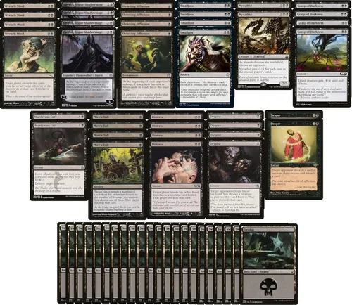 En MTG Decks & More tenemos una experiencia combinada de más de 50 años construyendo y jugando mazos de estándar a moderno y comandante (¡y más!) tanto a un nivel competitivo y casual. Construimos mazos potentes y divertidos. A la venta es una baraja de descartes negra de Magic the Gathering personalizada de 60 cartas. ¡Fuerza a tu oponente a descartar su mano, y luego ganar rápidamente a través de Shrieking Affliction y Davriel, Rogue Shadowmage! ¡La baraja también cuenta con una serie de poderosos hechizos y efectos de eliminación! Legal moderno. Listo para jugar