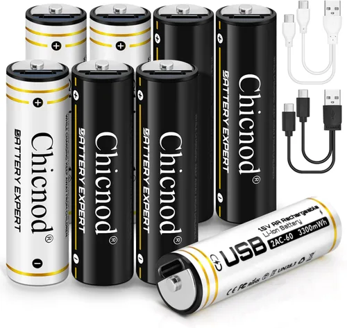 Carga rápida USB-C y paquete de 8 unidades: carga rápida tipo C y ahorro de costos paquete de 8: cada batería de litio recargable CHICNOD 1.5V AA soporta carga rápida USB-C, completamente cargada en 2 horas. El diseño del paquete de 8 ofrece una mayor comodidad y valor para dispositivos de alto consumo como juguetes, linternas y controladores de juegos. Alta capacidad de 3300 mWh y largo tiempo de ejecución: 3300 mWh de alta potencia, rendimiento confiable: proporciona energía duradera con capacidad de 3300 mWh, asegurando una salida consistente para cámaras, ratones inalámbricos, controles remotos y dispositivos domésticos inteligentes. Perfecto para usuarios que buscan baterías AA recargables de alta capacidad. Salida constante de 1,5 V para una potencia estable --- Voltaje constante de 1,5 V: Ofrece energía constante de principio a fin, sin caída de voltaje como las baterías tradicionales NiMH o alcalinas. Ideal para dispositivos electrónicos de alto drenaje que necesitan una salida estable, como micrófonos o luces LED. Ecológico y más de 2000 ciclos de recarga: ahorra dinero y el planeta: cada batería AA recargable CHICNOD se puede recargar más de 2000 veces, reduciendo los gastos de desperdicio y reemplazo. Hecho de materiales de iones de litio ecológicos, perfecto para consumidores ecológicos. Amplia compatibilidad y protección de seguridad: compatibilidad universal con protección inteligente: funciona con juguetes, linternas, controles remotos, teclados, cámaras y mucho más. Protección integrada contra sobrecarga, sobrecorriente y cortocircuito para un rendimiento confiable y una vida útil más larga.