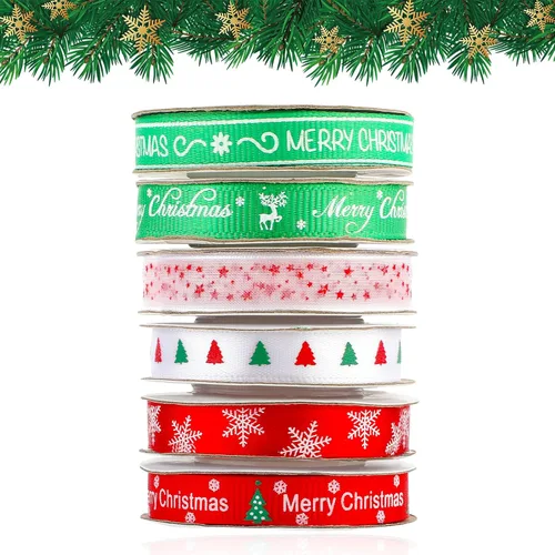 6 rollos de cinta de Navidad 3/8 de cinta de Navidad impresa de grogrén de Navidad, juego de cintas de envoltura de regalos navideños, cinta de copo