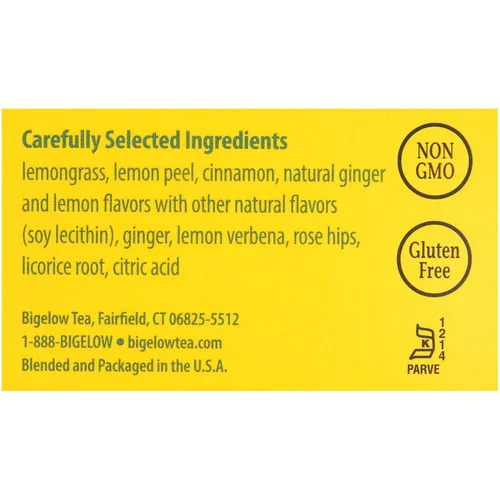 ZESTY y DULCE: Nuestro té de limón y jengibre es una deliciosa mezcla de limón y jengibre picante. Junto con la hierba de limón y la canela, Lemon Ginger proporciona un perfil de sabor dulce y ácido para este maravilloso té. Beber caliente o helado. Envueltos individualmente: Bigelow Tea siempre vienen envueltos individualmente en bolsas de aluminio para obtener el máximo sabor, frescura y aroma para disfrutar dondequiera que vayas. Sin gluten, sin calorías y certificado Kosher; Bigelow Tea ofrece todos los beneficios para la salud del té. Prueba cada sabor: hay un Bigelow Tea para cada estado de ánimo y en cualquier momento del día. Despiértate por la mañana con English Breakfast, disfruta de un impulso antioxidante por la tarde del té verde, o relájate y restaura con uno de nuestra variedad de tés de hierbas sin cafeína. Mezclado y empaquetado en los Estados Unidos: En 1945, Ruth Campbell Bigelow creó nuestro primer té, Constant Comment, un té negro fuerte y sabroso mezclado con cáscara de naranja aromática y especias dulces calientes. Hoy en día, Bigelow sigue siendo 100% familiar Calidad sin compromisos: desde 1945, Bigelow Tea ha sido líder en té premium y se enorgullece de ser una corporación certificada B, cumpliendo con los más altos estándares verificados de desempeño social y ambiental, transparencia y responsabilidad