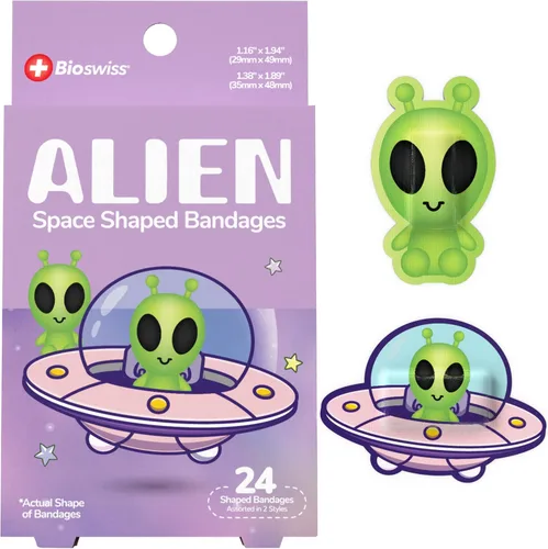 24 vendas alienígenas de Halloween: el paquete de vendas adhesivas con forma de alienígena ayuda a proteger cortes, rasguños y heridas menores mientras hace que la curación sea menos estresante; los vendajes vienen en 2 estilos surtidos Sin látex y estéril: cada vendaje es seguro para pieles sensibles y envuelto individualmente para un cuidado higiénico y sin preocupaciones; las vendas BioSwiss son elegibles para HSA o FSA Fuerte adherencia y ajuste flexible: cada vendaje se mantiene firmemente en su lugar mientras se mueve, con una almohadilla absorbente antiadherente para una fácil extracción y comodidad Primeros auxilios diarios: nuestros vendajes autoadherentes son óptimos para viajar o en casa; cabe fácilmente en bolsos, mochilas y botiquines de primeros auxilios Diseños coloridos: nuestros coloridos diseños de vendaje ayudan a que el cuidado de heridas sea menos intimidante; óptimo para cumpleaños, regalos de fiesta y cestas de truco o trato