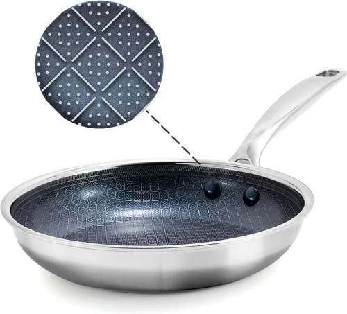 TECNOLOGÍA HÍBRIDA DE VÍNCULO DE DIAMANTE: Nuestra tecnología patentada fusiona tres capas de acero inoxidable con una superficie de textura de diamante grabada con láser y un revestimiento antiadherente de cerámica libre de PFAS. Esta combinación ofrece 10 veces más durabilidad, 6 veces más respuesta al calor y un revestimiento antiadherente 4 veces más duradero. Sartén de acero inoxidable de 8 pulgadas: incluye una sartén híbrida de 8 pulgadas, perfecta para sellar, carne, pollo, pescado, huevos y más. Diseñado para una larga durabilidad: construcción resistente y resistente a los arañazos que soporta el uso de horno/asador de 850 °F (tapas de vidrio a 425 °F). Las asas remachadas fundidas que se mantienen frías proporcionan un agarre y control seguros, mientras que los bordes envueltos resistentes a las astillas, facilitan el vertido limpio. Las tapas de vidrio templado mantienen el sabor, y el diseño apto para lavavajillas hace que la limpieza sea sin esfuerzo. 10 VECES MÁS SEGURO PARA UTENSILIOS DE METAL: Increíblemente resistente a los arañazos y construido para durar a través de innumerables comidas. 4 VECES MÁS ANTIADHERENTE: El revestimiento antiadherente reforzado con diamantes funciona con los cuerpos de acero inoxidable de 3 capas para una durabilidad diaria y liberación de alimentos sin esfuerzo. Apto para lavavajillas: la mayoría de los desastres se limpian, pero esta sartén es apta para lavavajillas para una limpieza aún más fácil. RESPUESTA AL CALOR 6X MÁS RÁPIDA: Esta sartén está optimizada para un calentamiento uniforme en todas las estufas, incluyendo inducción. Segura para horno y asador hasta 850°F.