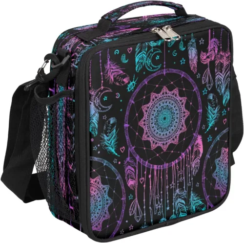 Bolsa de almuerzo con atrapasueños, lonchera bohemia, bolsa de almuerzo aislada, bolsa de mano térmica con correa de hombro ajustable extraíble