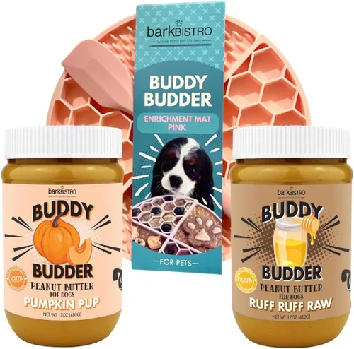 Pregunta sugerida sobre BUDDY BUDDER Pumpkin Pup + Ruff Ruff Raw Red Dog Enrichment Mat Combo, 100% mantequilla de maní natural, golosinas saludables para perros, fabricado ¿Este producto sí me sirve para lo que necesito?