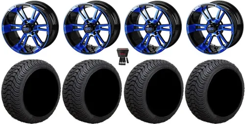 This Kit is Ready-to-Ride with FREE Mounting & Lug Kit! Bundle of: (4) LSI Raptor 12x7 Golf Cart Wheel - Black/Blue 3+4 [12184] + (4) Arisun Cruze AT21 (4ply) Golf Tire [215x35-12] + (1) Gorilla 1/2" x 20 Lug Kit & Valve Stems - Black [K4CS-00012BGR] + (4) Tire Mount on Golf Cart Wheel