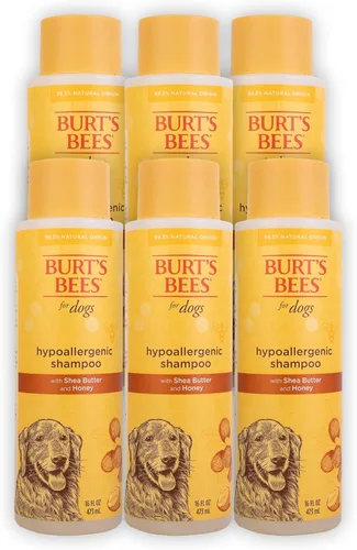 Burt's Bees for Pets El champú hipoalergénico para perros es un champú suave para perros hecho para perros sensibles y cuidado rutinario del pelaje. La fórmula sin fragancia ayuda a limpiar el pelaje durante los baños regulares mientras apoya la piel delicada con un lavado suave hecho para rutinas de aseo normales. Este champú para perros de 16 onzas está hecho con manteca de karité y miel de origen natural para ayudar a calmar la piel, acondicionar el pelaje y apoyar el equilibrio de pH único para las mascotas. La fórmula contiene un 95% de ingredientes de origen natural y está hecha sin detergentes químicos, ftalatos, parabenos, sulfatos, colorantes añadidos o colorantes. Use el champú como parte del baño normal del perro y enjuague bien después del lavado. La fórmula de baja espuma ayuda a facilitar la limpieza para los padres de mascotas, y la botella está empaquetada en un 80% de material reciclado posconsumo. Fabricado en los Estados Unidos con ingredientes globales solo para perros.