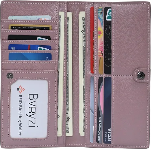 Revestimiento de Cuero Cierre de Broche de presión Limpiar con un Paño Seco 100% cuero genuino de grano completo con acabado granulado, se siente lujoso y cómodo. Seguridad y privacidad: nuestras carteras están equipadas con un avanzado material de bloqueo patentado, que bloquea las señales RFID y protege la valiosa información privada almacenada en los chips RFID de escaneos no autorizados. Probado y aprobado por laboratorio de pruebas independiente. Probado de 10 MHz a 3000 MHz, incluyendo 13.56 MHz en los que operan las tarjetas de crédito. Diseño delgado: 11 ranuras para tarjetas de crédito, 1 ventana de identificación, 3 bolsillos para monedas/billetes, 1 bolsillo exterior con cremallera para cambio. El perfil delgado ocupa un espacio muy pequeño de tu bolso. Dimensiones: 7.48 "L x 3.74 "W x 0.59 "H Funcionalidad versátil: más que solo tu cartera o bolso estándar, este bolso de mano y tarjetero tiene espacio para tarjetas, dinero y tu teléfono celular Listo para negocios y viajes: ¿vas a una reunión de negocios o una noche en la ciudad? Esta cartera multifuncional es ligera y fácil de llevar.
