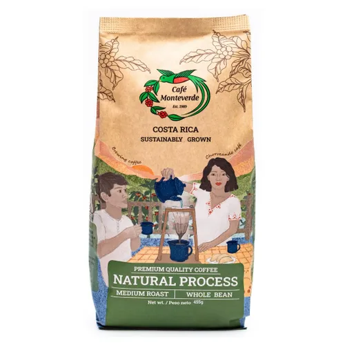 Cafe Monteverde Natural Proceso es complejo de frutas y notas florales con esencia de cedro dulce y bayas ácidas. Con este proceso seco en la fruta, experimentará los sabores completos y complejos de la cereza del café. Tostado fresco a pedido en el origen del Café Monteverde en Monteverde, Costa Rica. Directo de pequeñas fincas cafetaleras en Monteverde, entre 1.300 y 4.8 ft sobre el nivel del mar, adyacente al único y biodiverso Bosque Nuboso de Monteverde, café 100% café arábica y variedades como Caturra, Catuaí. Sostenibilidad cultivada en la finca educativa Life Monteverde. Terceros certificados por Friend of the Earth para agricultura sostenible.