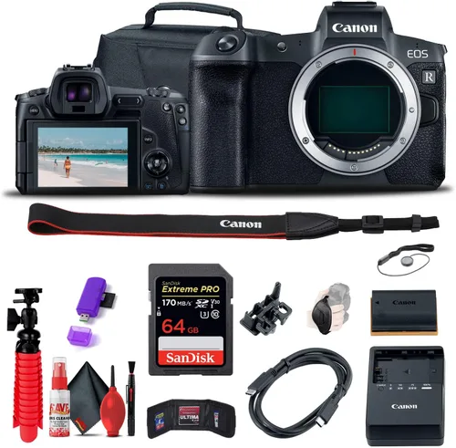 El paquete incluye: 1 cámara digital Canon EOS R sin espejo (solo cuerpo), 1 tarjeta SanDisk SecureDigital de 64 GB Extreme PRO Cmemory Card, 1 bolsa para cámara, 1 lector de tarjetas de memoria, 1 trípode flexible de 12 pulgadas, 1 correa de mano, 1 protector de tapa de lente, 1 cartera para tarjetas de memoria, 1 kit de limpieza El primer paso en la evolución sin espejo de Canon, la EOS R combina un soporte de lente rediseñado y un sensor de imagen de fotograma completo actualizado para un sistema de cámara multimedia único y sofisticado. Girando en torno al nuevo soporte de lente RF, la EOS R está preparada para ser el medio para aprovechar al máximo una nueva serie de lentes y tecnologías ópticas. Centrándose en la propia cámara, la EOS R cuenta con un sensor CMOS de fotograma completo de alta resolución de 30.3MP junto con un procesador de imagen DIGIC 8. La combinación de estas tecnologías ofrece un amplio rango de sensibilidad hasta una ISO 40000 nativa, disparo continuo rápido a 8 fps y grabación de video UHD 4K30. Además de la obtención de imágenes, el sensor también facilita un avanzado sistema AF Dual Pixel CMOS, que utiliza 5655 puntos seleccionables para adquirir enfoque de forma rápida y precisa. Este sistema de enfoque también es sensible a EV -6 para trabajar en condiciones impresionantemente oscuras. El sistema AF también se adapta perfectamente a las capacidades de grabación de video UHD 4K, que también se completan con Movie Digital IS para minimizar el movimiento de la cámara, gamma Canon Log integrado para un mayor rango dinámico. Sensor CMOS de fotograma completo de 30.3 MP - Procesador de imagen DIGIC 8 - Video UHD 4K30; registro C y salida HDMI de 10 bits - AF CMOS de doble píxel, 5655 puntos AF - Visor electrónico OLED de 12.1 ft - Pantalla táctil giratoria de 6.9 ft LCD - ISO 50-10 expandido 2400, Disparo de 8 fps - Wi-Fi y Bluetooth, ranura para tarjeta SD UHS-II - Barra multifunción, RAW de doble píxel