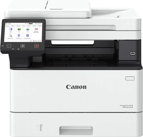 Diseñado para oficinas pequeñas y domésticas y entornos de trabajo híbridos, el modelo imageCLASS MF462dw II equilibra un rendimiento rápido y un mantenimiento mínimo. El MF462dw II es fácil de configurar y tiene una pantalla táctil a color personalizable de 5" que ofrece una experiencia de usuario intuitiva. El MF462dw II tiene velocidades de impresión rápidas de aproximadamente 37 páginas por minuto para mantenerse al día con su negocio. El MF462dw II utiliza un tóner original Canon de alta calidad 070 / 070 H, para una salida audaz y nítida en la que tu empresa puede confiar. El tóner 070 produce aproximadamente 3.000 páginas y Toner 070 High-Capacity rinde aproximadamente 10.200 páginas. El MF462dw II ofrece una capacidad de papel normal de hasta 250 hojas en el casete estándar, 100 hojas en la bandeja multiusos y capacidad de papel expandible de hasta 900 hojas utilizando casete opcional AH-1 que tiene capacidad para 550 hojas. El alimentador automático de documentos (ADF) de 2 lados tiene capacidad para hasta 50 hojas y escanea ambos lados de su documento en una sola pasada utilizando la función de escaneo de una sola pasada, lo que le ayuda a ahorrar tiempo. Conéctese fácilmente de forma inalámbrica desde computadoras o dispositivos móviles. Imprima con una variedad de aplicaciones móviles, incluida la aplicación Canon PRINT con su dispositivo móvil compatible. El MF462dw II viene con una garantía limitada de 3 años y está respaldado por la red de servicio y soporte de Canon.